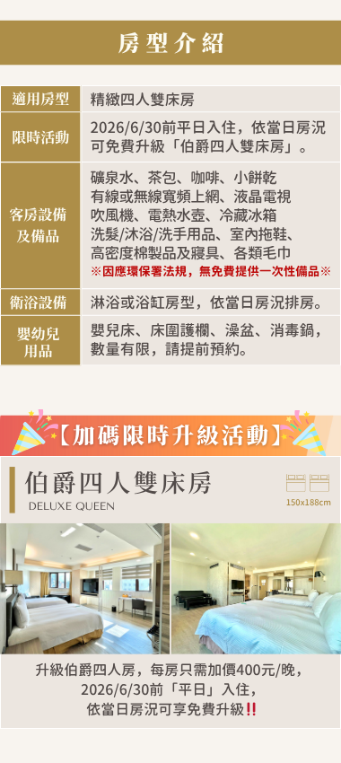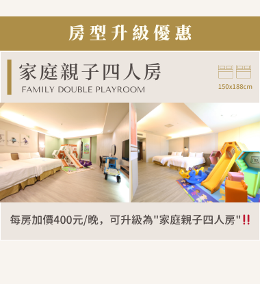 6.本票券可加價400元升級【伯爵四人雙床房】或【親子四人雙床房】。