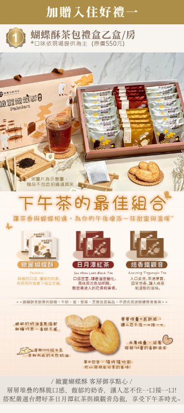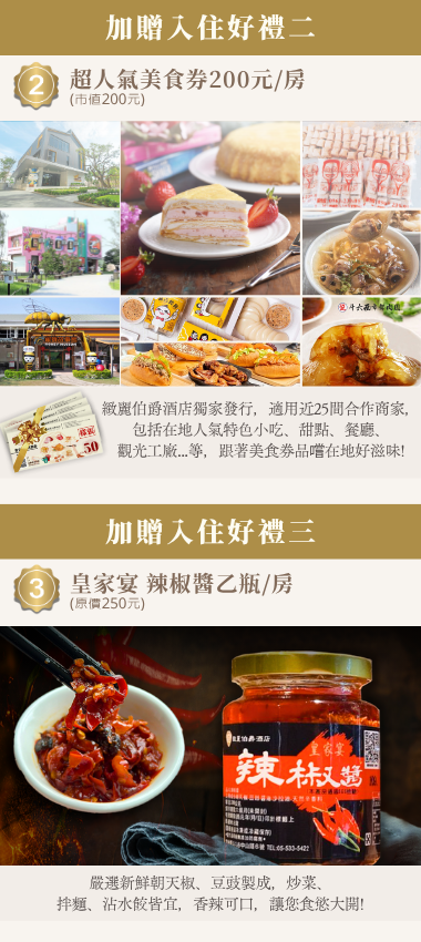2.贈送四客景觀自助早餐;優惠期間加贈:美食抵用券200元/房、蝴蝶酥茶包禮盒乙盒/房、辣椒醬乙瓶/房。