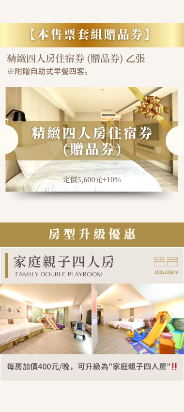 6.本票券可加價400元升級【伯爵四人雙床房】或【親子四人雙床房】。