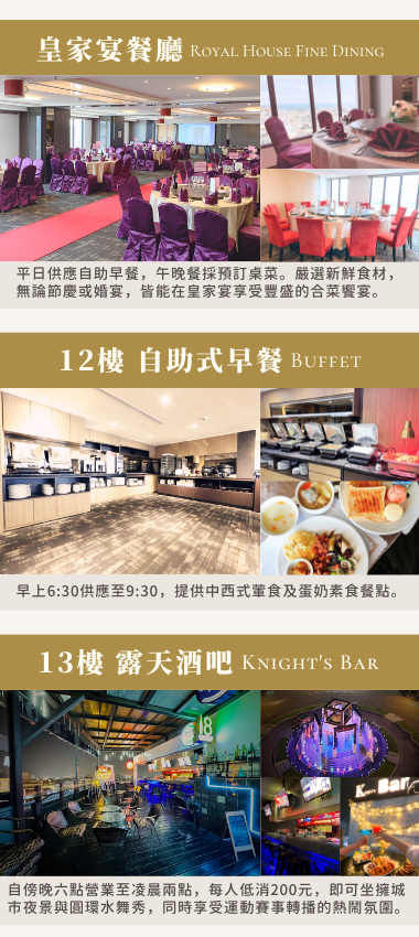 3.一般假日:週六、連續假日、農曆春節初五及其他假日(依飯店行事曆公告)使用需加價600元。
