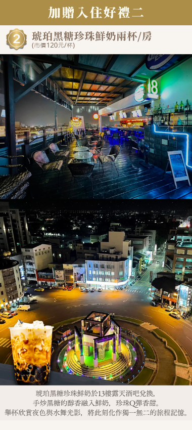 2.贈送二客景觀自助早餐;優惠期間加贈:黑糖珍珠鮮奶兩杯/房、蝴蝶酥茶包禮盒乙盒/房。
